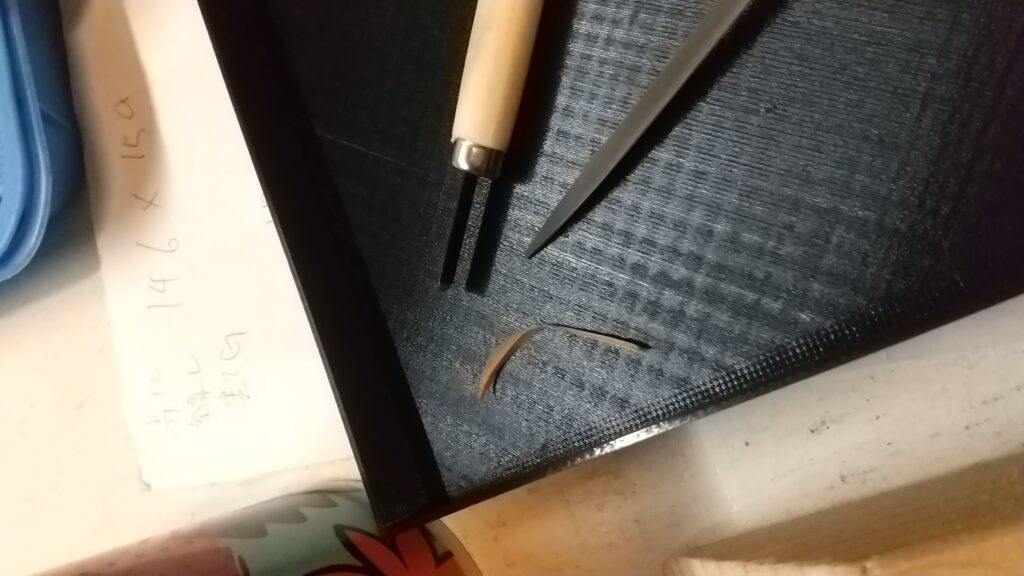 1分ほど軽く研いだらぴろっと長めに彫れるようになった。感覚的には、ほとんど使っていない小学校で買った息子の彫刻刀の半分ぐらいの切れ味。ちゃんと研げば切れるようにはなるんだろう。