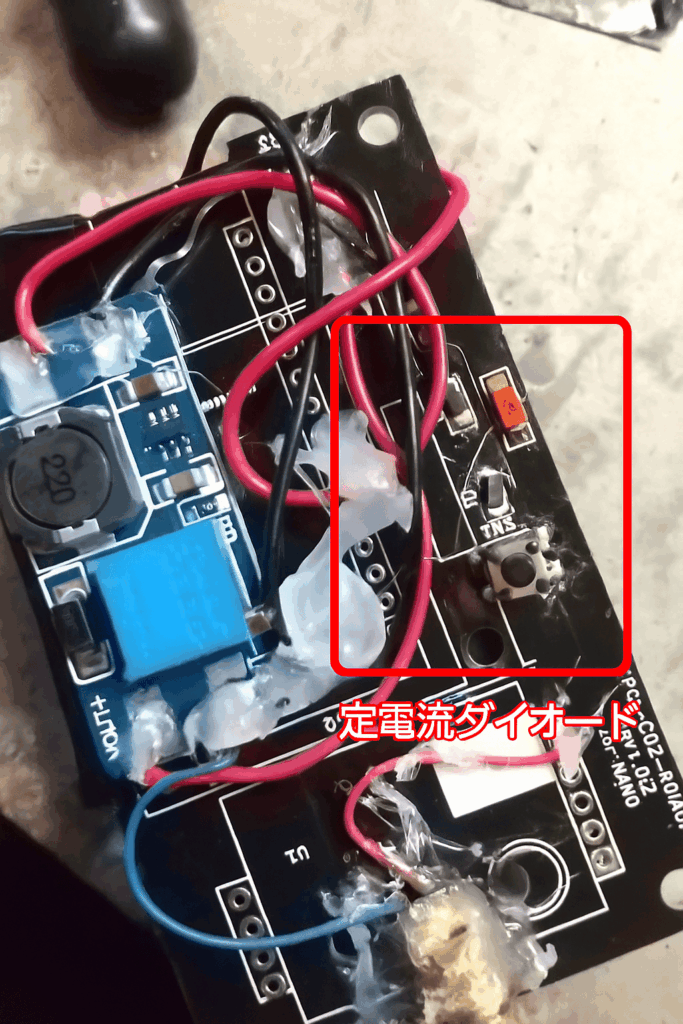 というわけでAliで売っているいつもの昇圧コンバーターで昇圧。どうせ、昇圧するなら作るの簡単な定電流ダイオード2並列で雑に作ろうということで定電流ダイオード(秋月のこいつ)の動作に必要な4.3vをたして3V(レーザー)+4.3V(定電流ダイオード)の7.3V以上に昇圧。(ちょっと余裕持たせて8.5Vぐらい)