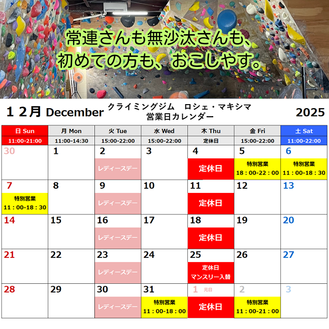 2025年12月 2025年12月1日未分類nishida 12月5日 18:00から22:006日 11:00から18:307日 11:00から18:30 31日 11:00から18:00 2026年1月1日 お休み2日 11:00~21:003日 11:00~22:004日 11:00~21:005日 11:00~14:30